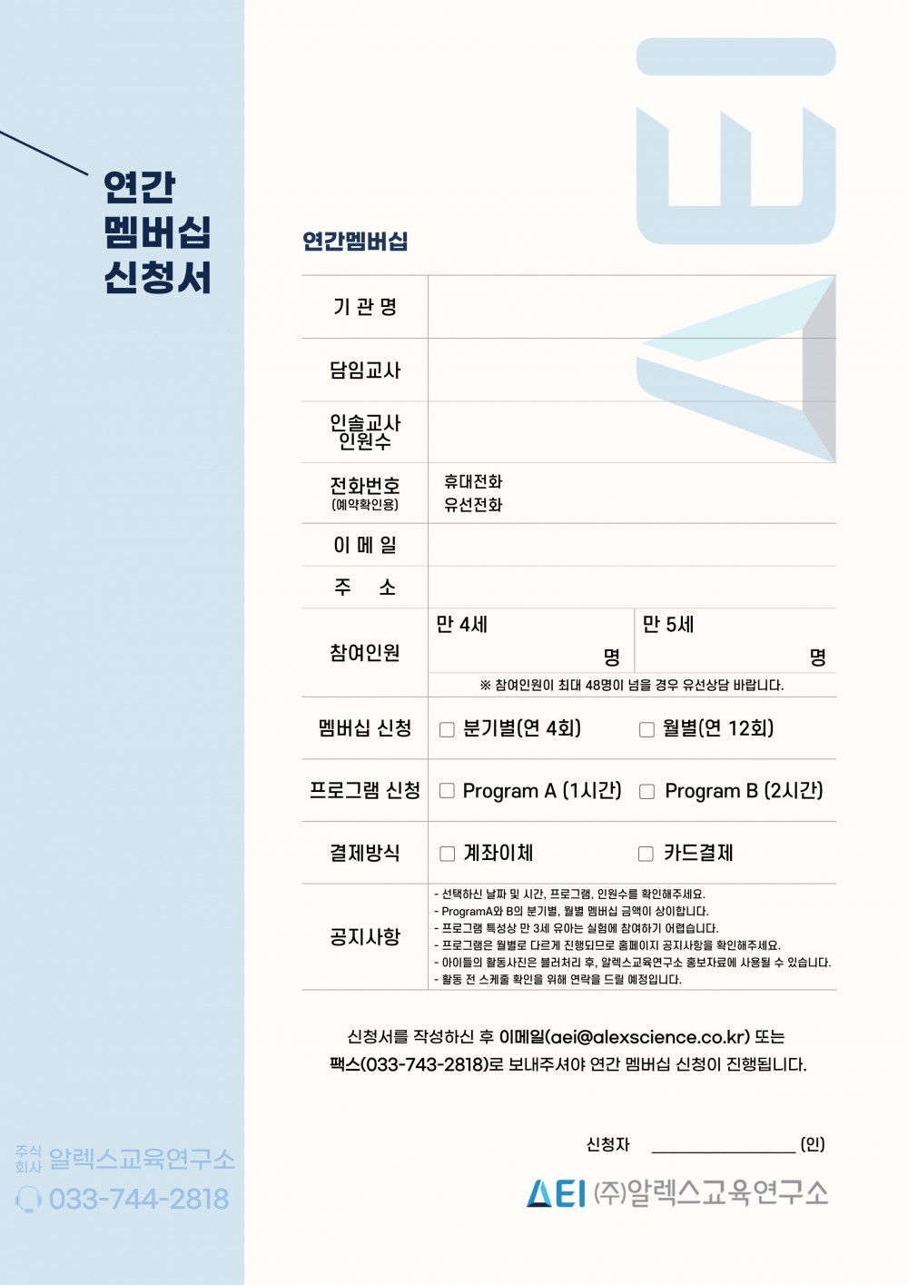 기재항목을 적으신 후, 이메일(aei@alexscience.co.kr) 또는 팩스(033-743-2818)로 보내주세요.