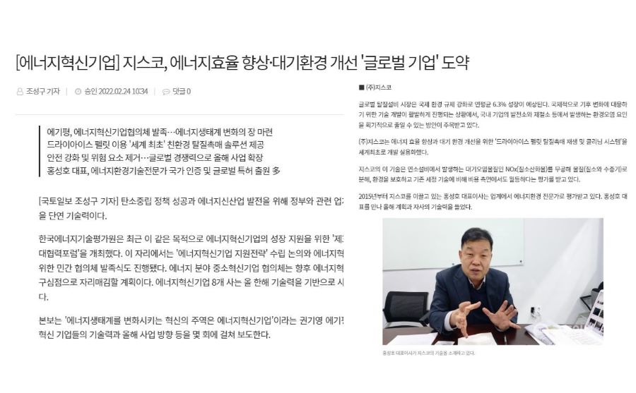 기사본문 보기 [에너지혁신기업] 지스코, 에너지효율 향상·대기환경 개선 '글로벌 기업' 도약 - 국토일보 (ikld.kr)