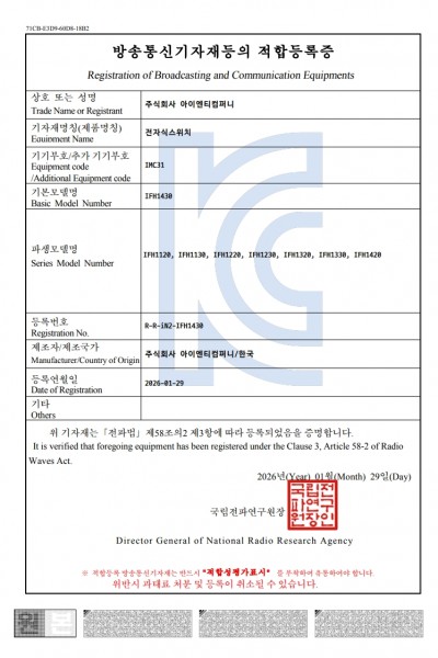 [방송통신기자재등록필증] IFH1430 외 파생모델 (26.01.29)