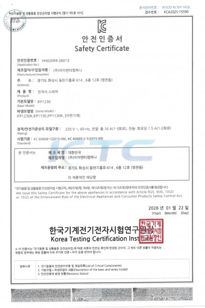 [전기안전인증서] IFP1230 외 파생모델 (26.01.22)