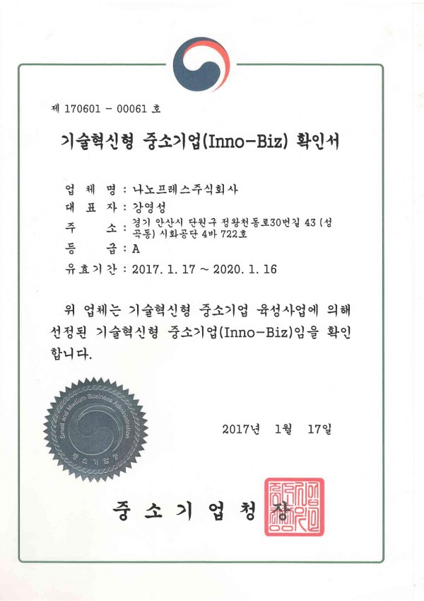 NANO PRESS is certified according to the CE CERTIFICATE, CERTIFICATE OF PATENT, INNO-BIZ. NANO PRESS's