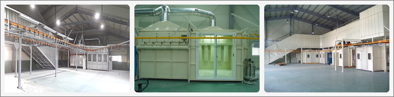 • 전처리(Deep or Spray type), Powder Booth(Reciprocate를 이용한 자동방식 or 일반작업자가 직접 도포하는 수동방식) 건조시설(Baking Oven:산형 or 평형), 제품을 이송하는 Conv'y Line(Trolley Conv'y or Floor Conv'y) 환경설비(A.C Tower, A.H.U)등으로 구성되어 있습니다.