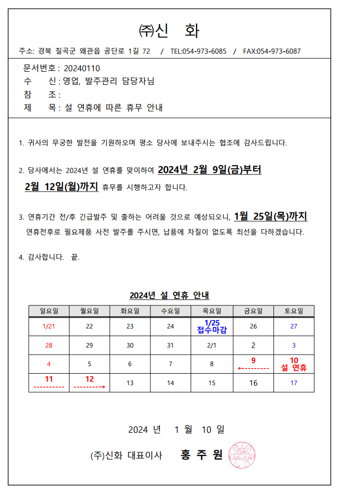 설 연휴에 따른 발주 가능 일정 안내 페이지 정보 작성자 최고관리자 댓글 0건 조회 485회 작성일 24-01-18 17:23 목록 본문 설 연휴에 따른 발주 가능 일정 안내 이전글2024년 추석 연휴에 따른 발주 가능 일정 안내 24.08.26 다음글카카오톡 채널을 오픈했습니다. 22.12.09 댓글 0 댓글목록 등록된 댓글이 없습니다.