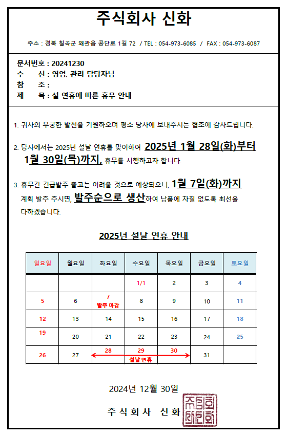 2025년 설 연휴에 따른 발주 가능 일정 안내 페이지 정보 작성자 최고관리자 댓글 0건 조회 510회 작성일 25-01-02 11:11 목록 본문 2025년 설 연휴에 따른 발주 가능 일정 안내 이전글2025년 여름 하계휴가 안내 25.07.03 다음글2024년 추석 연휴에 따른 발주 가능 일정 안내 24.08.26 댓글 0 댓글목록 등록된 댓글이 없습니다.