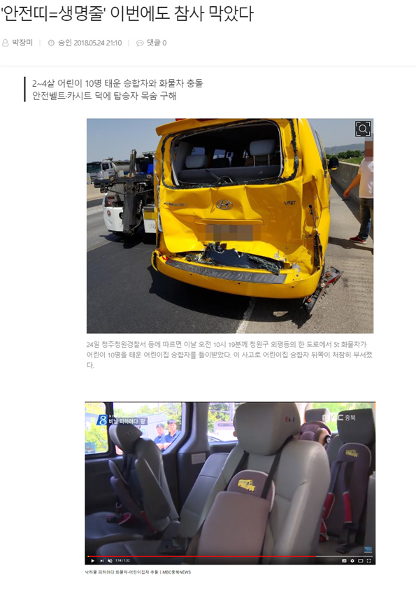 경찰 관계자는 “이번 사고에서도 어린이집 승합차에 탑승한 교사들과 어린이들이 모두 안전벨트와 카시트를 착용하고 있어 큰 인명피해로 이어지지 않은 것 같다”고 말했다. 박장미 기자