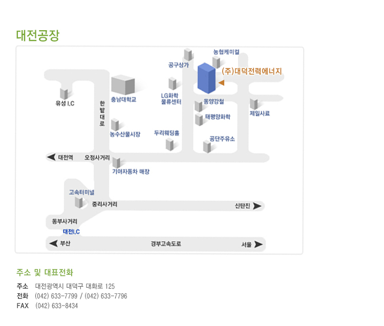 상호 : (주)대덕전력에너지 | 대표자 : 김대연 | 주소 : 대전 대덕구 대화로 125 (대화동 294-11) | 사업자등록번호 : 305-86-25860