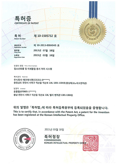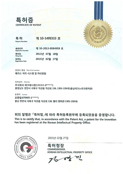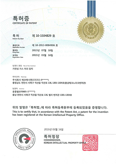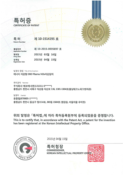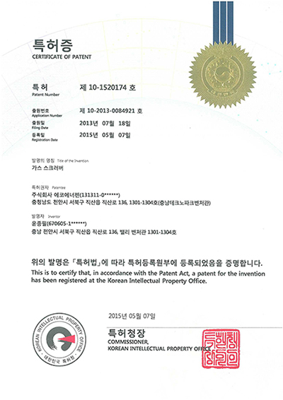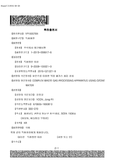 가스스크러버 가연성가스처리장치 기업부설연구소인정서 벤처기업확인서 복합폐가스처리장치출.. 에너지 저감형 DBD... 오존수를 이용한... 이노비즈인증서 질소산화물 및 미세먼... 폐가스처리시스템 및... X X X X X X X X X X