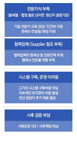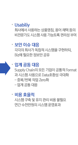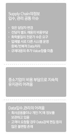 Chaser는 각각의 회사가 각자 시스템을 가지고 있는 것과 동일합니다. 따라서 각 회사별로 원산지 정보를 관리하면서, 모기업에게서 정보를 요청받거나 또는 협력사들에게 정보를 요청할 경우에만 Chaser를 이용해서 정보를 요청 또는 제공하면 됩니다. * Web에서 구현이 되므로 회사가 별도로 시스템을 도입할 필요가 없습니다. * On-line으로 Data 입수하므로 협력사로부터 입수한 Data에 대하여 재작업할 필요가 없습니다. * 신뢰성 있는 정보를 얻을 수 있으므로 사후검증에 대한 Risk를 줄일 수 있습니다. * 한 번 입수 정의된 정보는 여러 모기업에 제공이 수월합니다. * 개별적으로 구축하는 비용의 약 1/10 정도면 동일한 수준의 개별 시스템을 구축하는 효과를 얻을 수 있습니다.
