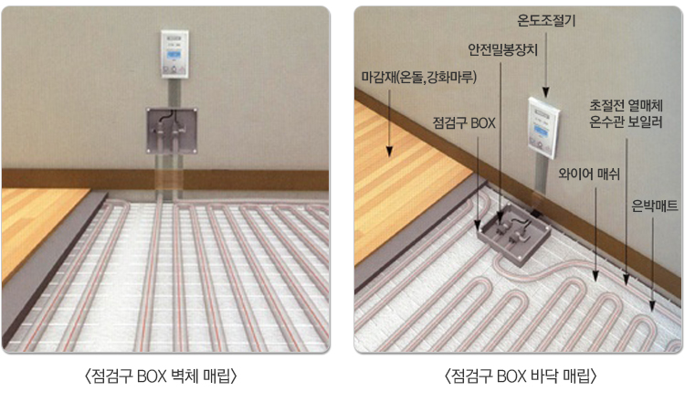 전열선 삽입 온수관 저온난방 시스템은 아주 단순하면서도 근본적으로 안전하다. 또한, 기능관리자를 필요로 하지 않고, 과열 방지기기 등 보잡한 제어 시스템도 필요 없다. 점검구 BOX를 통해 전열선 및 열매체 삽입이 가능하여 간편한 A/S가 가능하다.