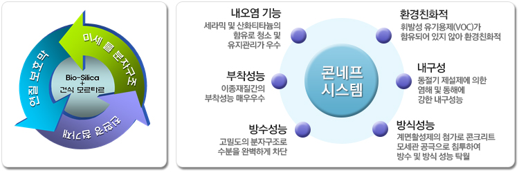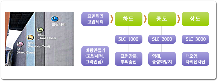 | 특징 및 기능 | 친수성 미세물분자(1이하)구조를 갖는 연질성 수지에 실리카겔, 일라이트 및 구리분말 등이 첨가되어 친환경 고기능성을 부여한 중성화 및 염해방지층과 아크릴계 재료에 의한 표면강화/오염방지 마감층을 갖는 다중 기능성 도포형 기술 | pH 10∼12의 알칼리성인 수성Epoxy 수지와 액화특수시멘트 및 세라믹 재료를 초기와 중간 공정 재료로 사용하고, 고기능성인 아크릴폴리에스테르 우레탄수지 도료로 마감 도포하는 이중도포 방식의 기술 | 유성계 폴리우레탄수지를 접착제로 하여 알루미늄금속분을 혼합한 재료를 콘크리트구조물 표면에 수회 도포하여 도막을 형성시키는 단일 수지계 재료로 도포하는 방식의 기술 | |