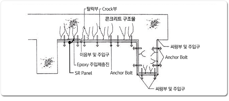 SR 패널 내진 보강 공법 개요구조보강 또는 내진보강이 필요한 콘크리트 부재에 SR(Seismic Reinforcement) 패널을 Anchor Bolt로 장착한 후에 콘크리트 구조물과 패널과의 사이에 접착수지를 충진하여 콘크리트 구조물을 보강하는 방법